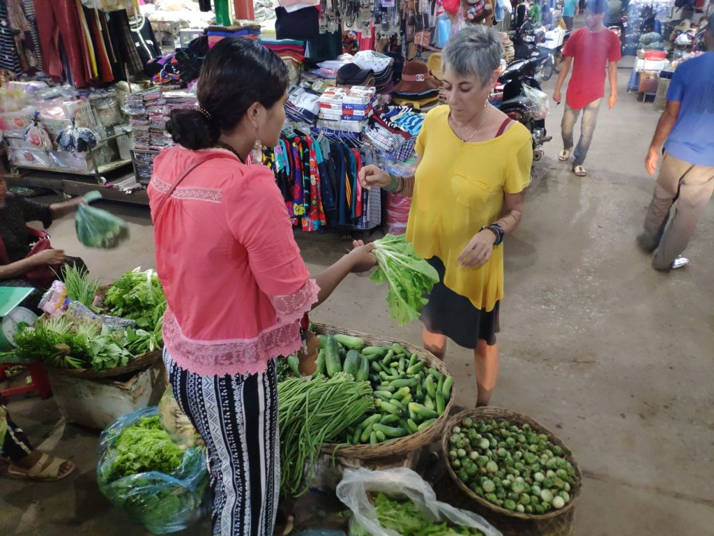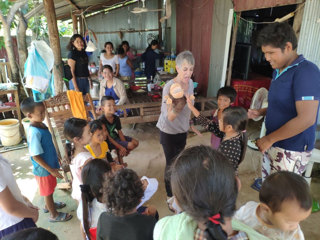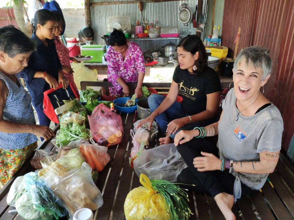 We learnt how to prepare fish amok, sweet and sour soup, and fried eggplant with pork. As schools remain closed throughout Cambodia the children of the families were well up for an impromptu English class.