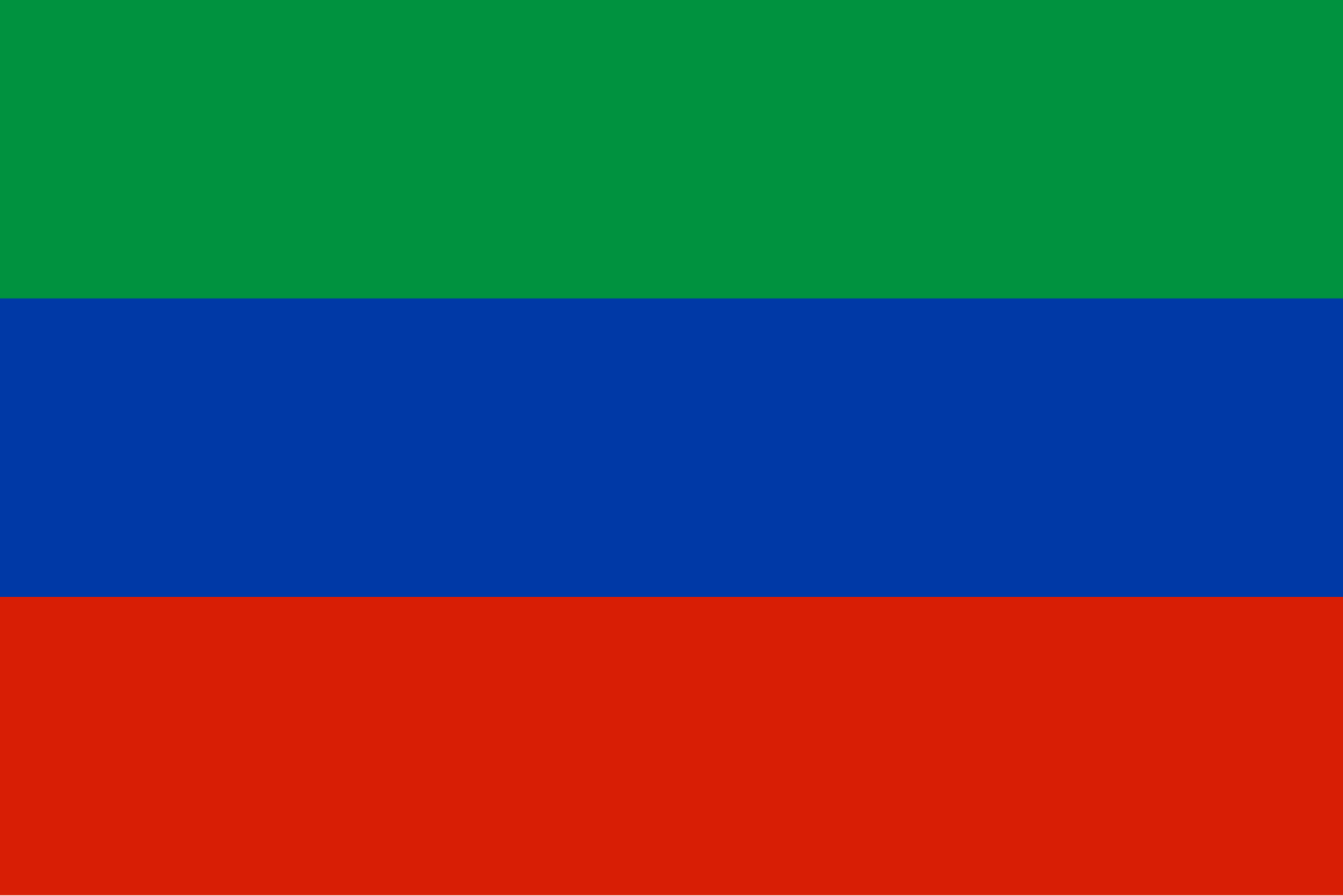 The tricolour Dagestani flag consists of the colour green, blue, and red in horizontal stripes. The top colour green symbolises the main faith of the Dagestani people, the middle blue represents the peaceful Caspian Sea and red symbolises courage and strength.