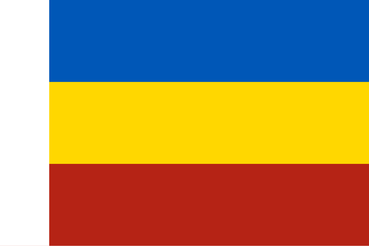 The flag of Rostov Oblast is displayed horizontally and vertically. The tricolour flag is influenced by the colours of the traditional Don Cossack flag. Blue stands for courage and perseverance, yellow represents the fertile lands of the region and red reflects valour and bravery. The vertical white stripe on the hoist side represent purity and peace.
