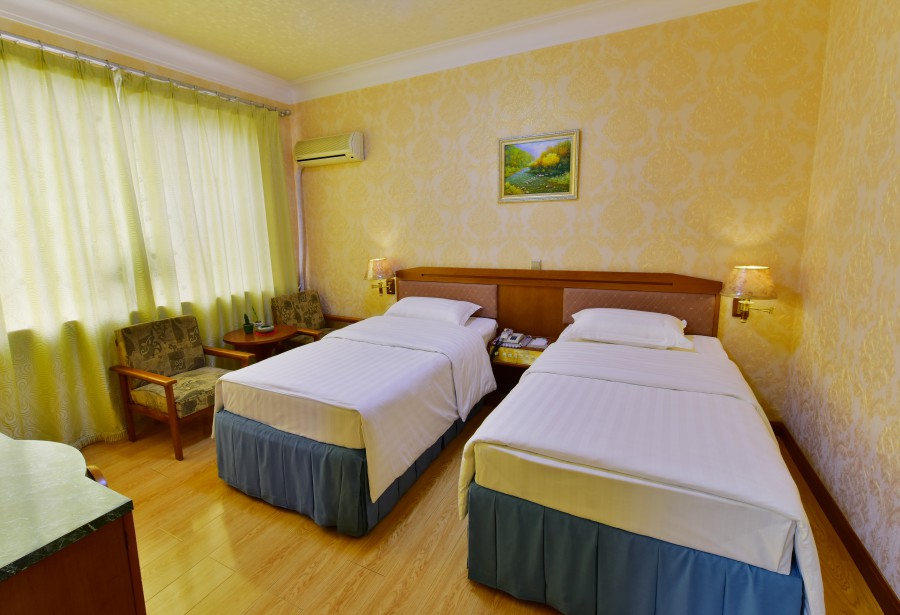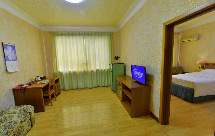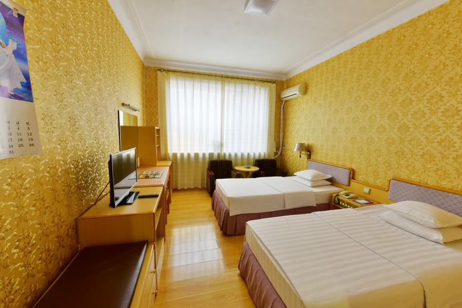 The Pyongyang Hotel, a second-class hotel in North Korea, features clean but basic rooms with amenities and international TV channels. Hot water is not available 24/7 but is available for a few select hours in the morning and evenings in the rooms. In total, the Pyongyang Hotel has 198 rooms with 5 suites, 53 deluxe rooms, 113 standard rooms and 27 budget rooms.