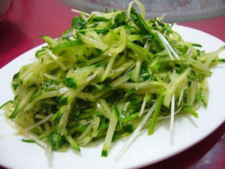 - 凉拌莜面 liangban youmian – People mix the steamed noodles with mashed potatoes. Add some cucumber and bean sprouts. Sauce includes salt and vinegar.