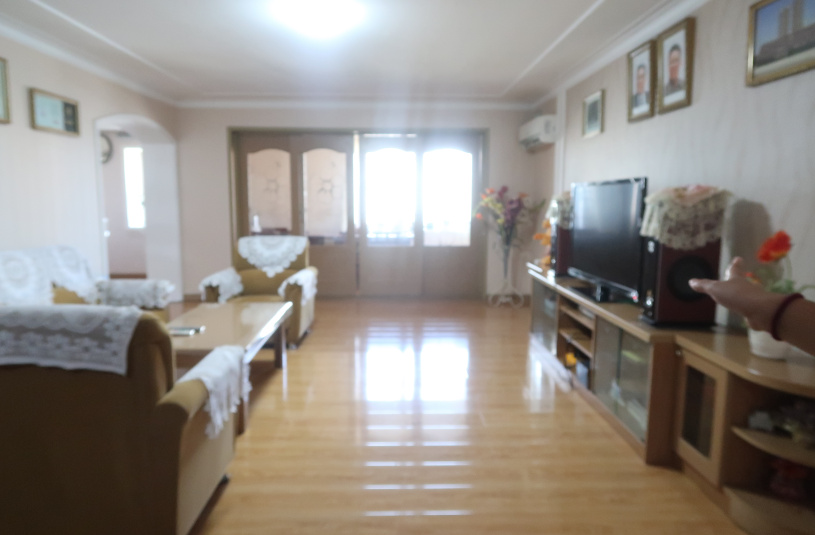 Located on the 20th floor of a large, caramel-coloured apartment complex, the inside of the apartment was immaculate, with not an object out of place. The mandatory portraits of the leaders hung above the television set in the living room, in addition to a framed photo taken during the housewarming event featuring Marshal Kim Jong Un standing alongside all the professors of the apartment complex.