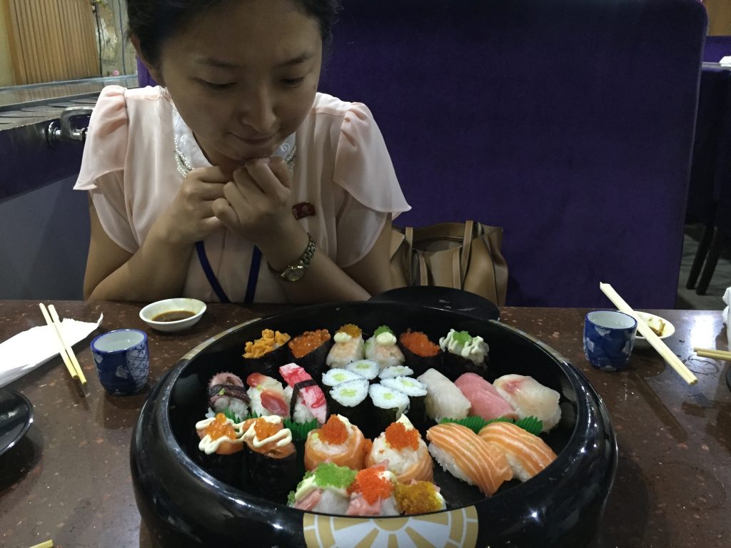 Pictured Above: A menu from a local restaurant in Pyongyang, Typical North Korean Dishes served at the Pyongyang hotel and one of our Korean colleagues enjoying Sushi in Pyongyang.