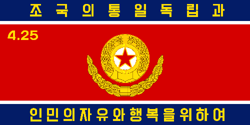 The Korean text “조국의 통일 독립과,인민의 자유와 행복을 위하여 “ located at the top and bottom of all the military flags translates into “For the unification and independence of the motherland, and the freedom and happiness of the people”
