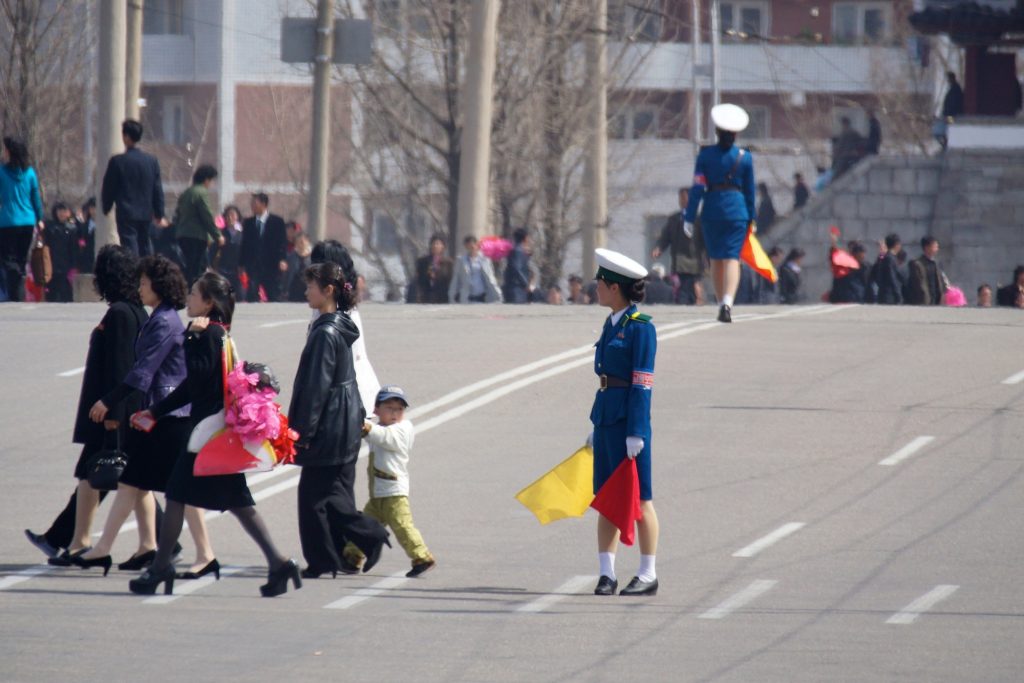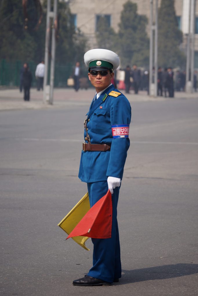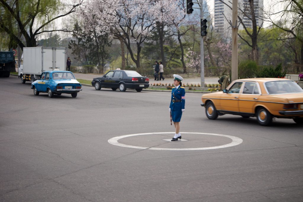 Outside of the capital of Pyongyang, automatic traffic lights are virtually non-existent, and the hard work of enforcing traffic rules is enforced in the old fashion way.
