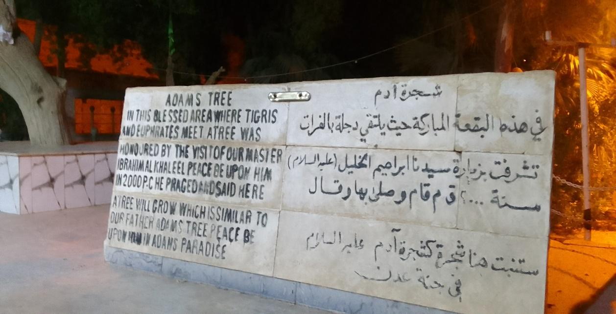 Marble stone with inscription in Arabic and English. “Adam’s Tree: In this blessed area where Tigris and Euphrates meet, a tree was honoured by the visit of our Master Ibrahim Al-Khaleel, peace be upon him, in 2000 B.C. He prayed and said: ‘Here a tree will grow which is similar to our Father Adam’s tree. Peace be upon him in Adam’s Paradise. [Ibrahim Al-Khaleel is the Muslim name for Abraham].