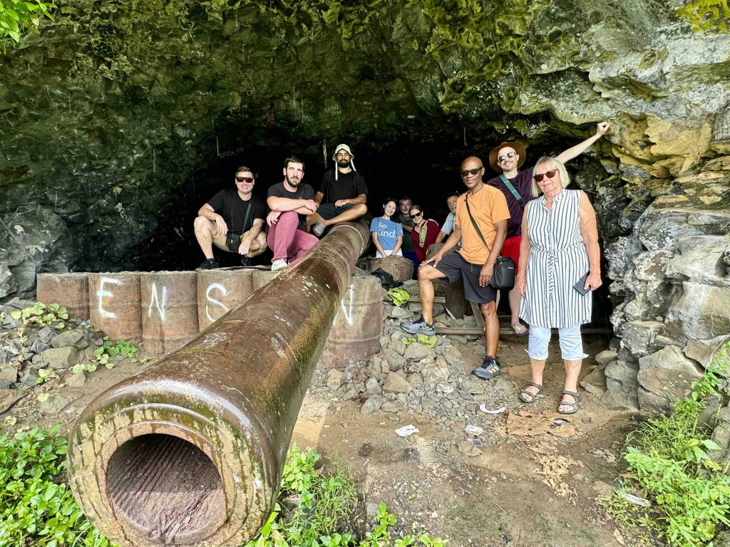 In the afternoon, embark on a land tour that showcases some of Chuuk’s historical landmarks. A great first stop is the Nefo Cave, an extremely well-preserved tunnel dug out by the Japanese during World War II. Here, you will find a nearly completely intact large artillery gun pointed out over the ocean, intended to stop an American amphibious landing that never came, as the majority of the fighting on the island took place between the respective air forces and navies of Japan and the US.