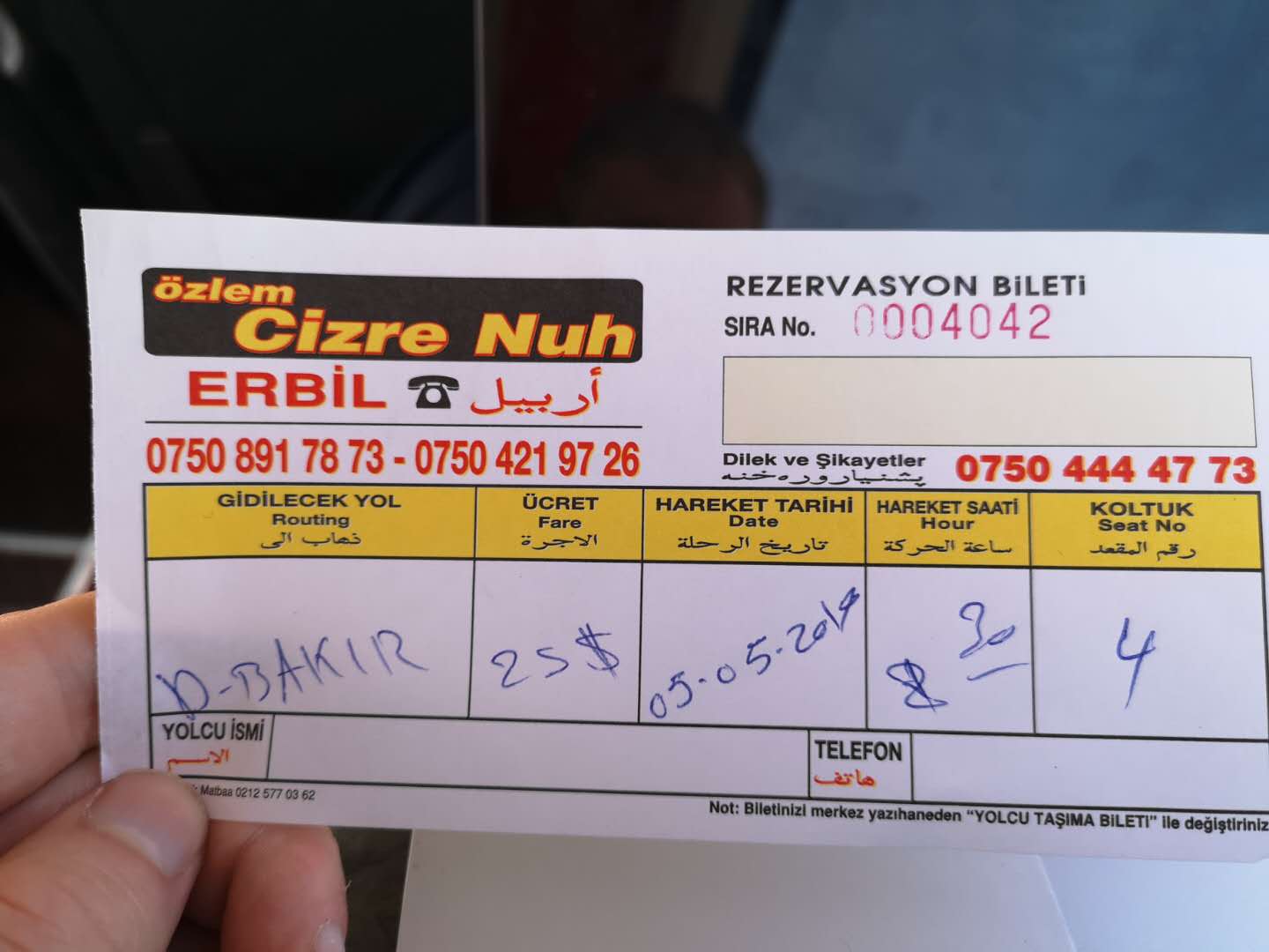 There are multiple bus companies offering their services. The prices and quality of the buses are usually quite similar. It’s around 25 USD (paid in cash) to get from Erbil to Diyarbakir. You will need your passport to book the ticket. Your passport will be taken by the ticket office and given back to you once you board the bus — somewhat strange, as if they think they might run away without using your paid ticket. There are also VIP buses in a 1×1 configuration with reclining seats, but those leave at night. In Erbil, buses generally leave from around 8 AM, 8 PM and 9 PM. The best thing to do is to ask your hotel or a friend to call a bus company the day before you plan your departures. Buses are seldom full in Sulaymaniyah and Erbil and, unless it is a holiday, you should be able to buy a ticket on the day.