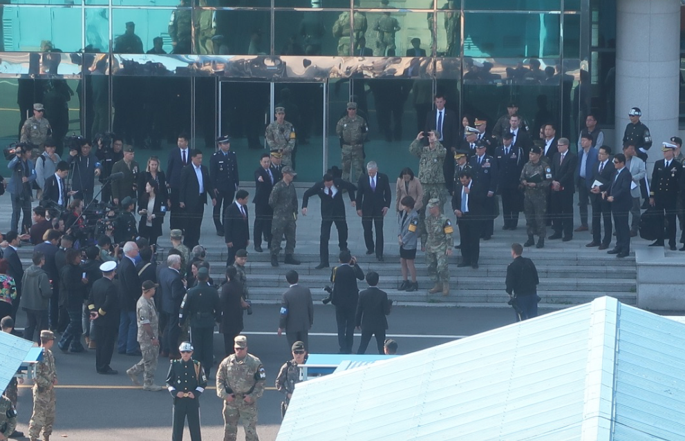 The DMZ (on both sides) can often be jam-packed with tourists, all edging for the best propaganda poster and clambering for the perfect shot with their patient military guide. As peak season comes to a close, you’re likely to have the DMZ all to yourself. This year, our Real Deal tour group was lucky enough to be in the right place at the right time to see action on “the other side” as U.S. Secretary of Defence Jim Mattis paid a visit to the south side with a massive entourage of media.