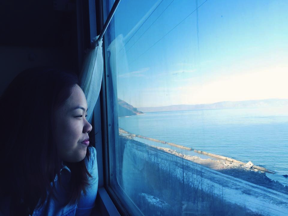 Sherlene pondering life whilst passing Lake Baikal – As we left the Siberian wilderness and inched closer and closer