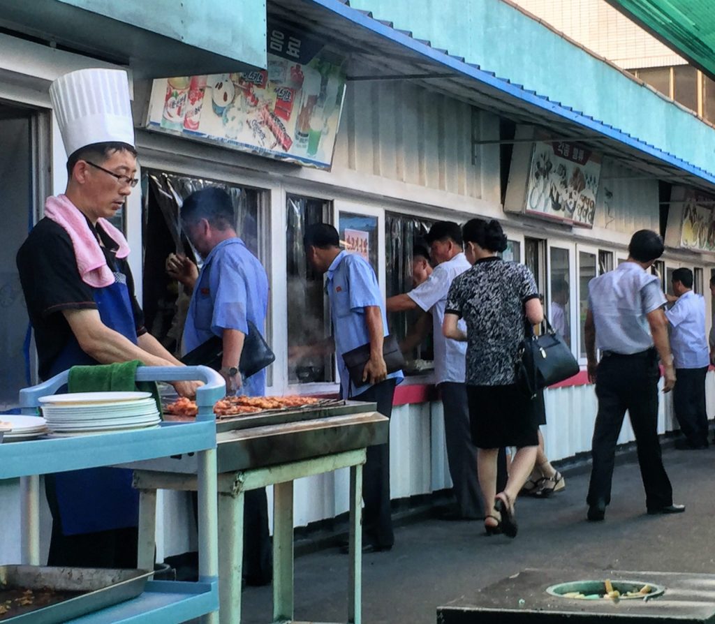 The highest floor of the shopping complex consists of the most incredible Korean food court in the country with offering Pyongyang Cold Noodles for as little as ₩5000, drafted beer for ₩1000 (which probably makes it the cheapest drafted beer in the world), a variety of Korean dishes.