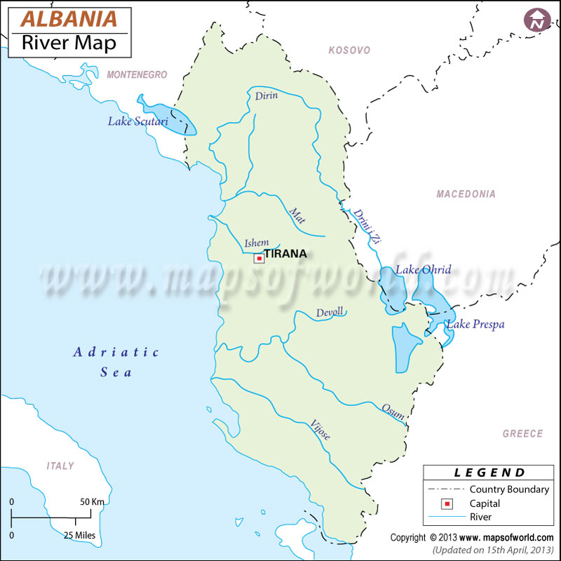 The longest river in Albania is the Drin which is about 175 miles long, this river originates in Kosovo. Other main rivers are the Seman, Shkumbin, and Vjosë, all of which drain the central part of the western plains. Albania also has many lakes, the most important of which are Lake Scutari (known in Albania as Lake Shkodër) in the northwest and Lakes Ohrid and Prespa along the eastern border.