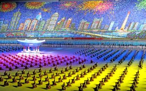 Formerly titled “Arirang”– named for a story long interpreted as an allegory for the forcible separation of the Korean Peninsula — the “Glorious Fatherland” Mass Games hit a more optimistic and peaceable note than the previous incarnation of the event. There has been a particular emphasis on friendship and peace, with special attention paid to the enduring friendship between the People’s Republic of China and the Democratic People’s Republic of Korea.