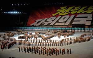 As previously noted, the DPRK upped their technological game in this incarnation of the Mass Games. In addition to the unparallelled choreography that sees thousands of students form a living mural and many thousands more engaging in flawlessly coordinated mass dances, the “Glorious Fatherland” Mass Games were notable for the introduction of choreographed drones to the event. Spectators were awed as the unmanned craft demonstrated their own considerable skills, forming the flag of the DPRK over the stadium as the audience watched.