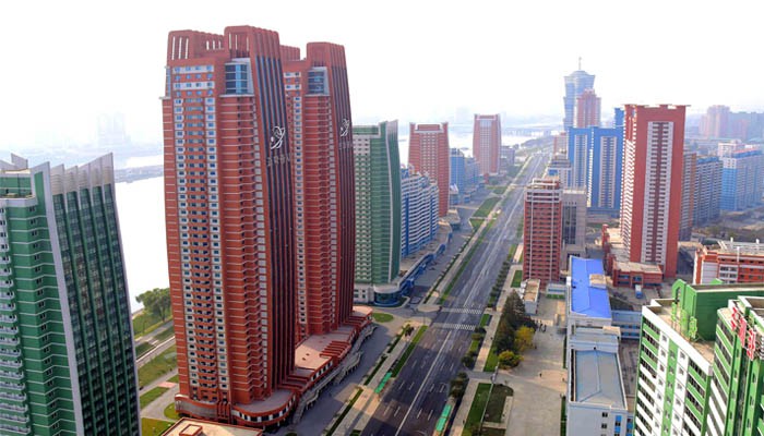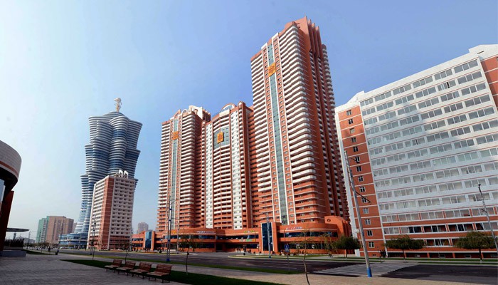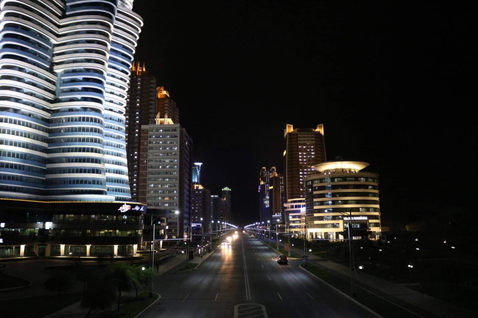 Mirae Future Scientist Street (미래과학자거리) is a six-lane street built in a retro-futuristic style located on the banks of the Taedong River in Pyongyang.