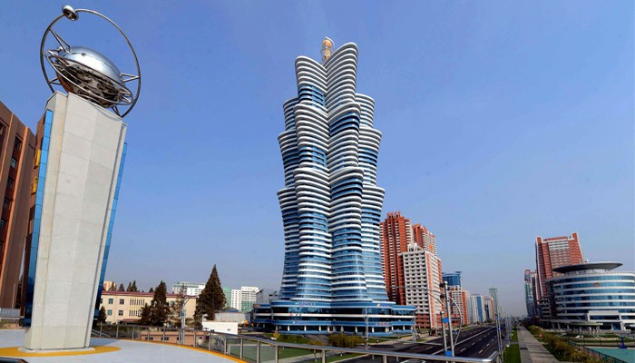 One of Pyongyang’s Tallest buildings is located on the street known as the Mirae Unha Tower (미래과학자거리 레지던스 은하) or ‘Future Galaxy Tower” This building is 53 stories (150m) and built in the style of a stretched atom.