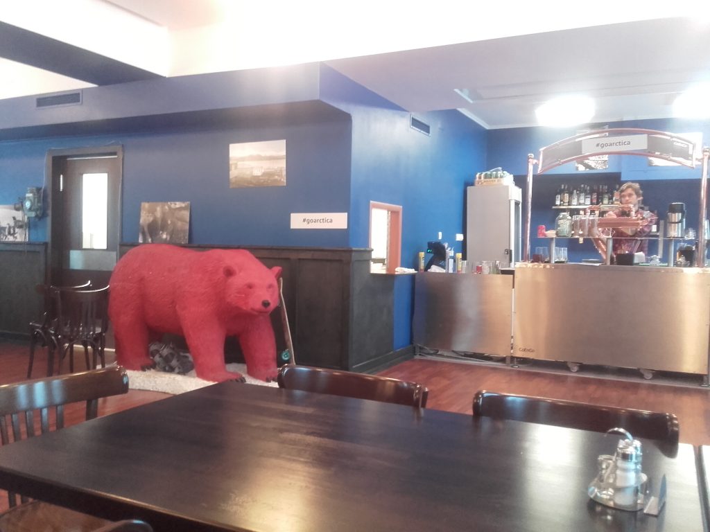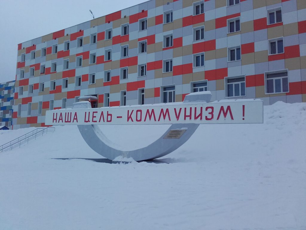 Leaving Lenin behind we walk the small and only road towards the cantina seeing a beautiful colored school and close to that the mineshaft. A big red building that really feels out of bounds if you’re not Russian. Just adjacent to that huge building is a smaller cantina/bar where we always took a short pitstop. Here you can buy Baltika beer (sort of the “local” Russian beer) and something in the small souvenir shop. This is the worker’s cantina so here is a great place to meet many locals.