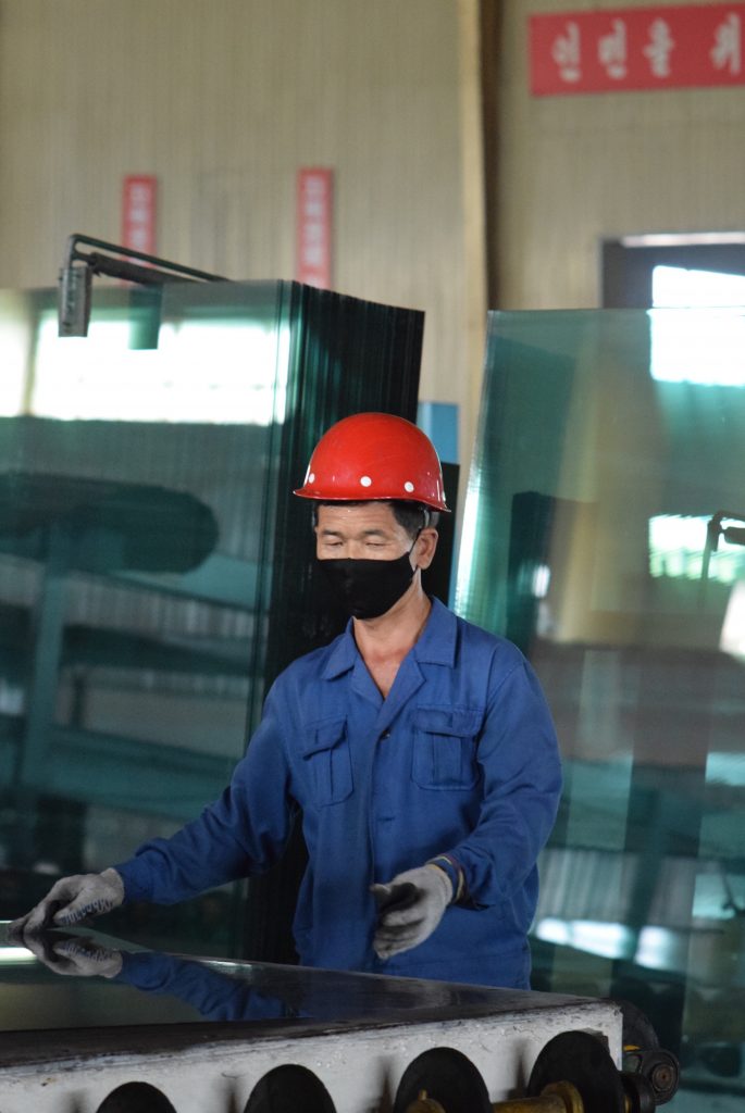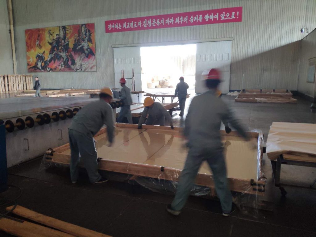 The tour then continues along the production line, as finished panes of glass slide down enormous rollers, cooling as they go. This is quite fun to watch, as an enormous crashing and crunching announces the occasional pane, which is judged to be of insufficient quality being dropped, smashed and ground up before your very eyes. The remainder are carefully crated up by workmen for shipping out to the numerous construction sites in Pyongyang and around the country.