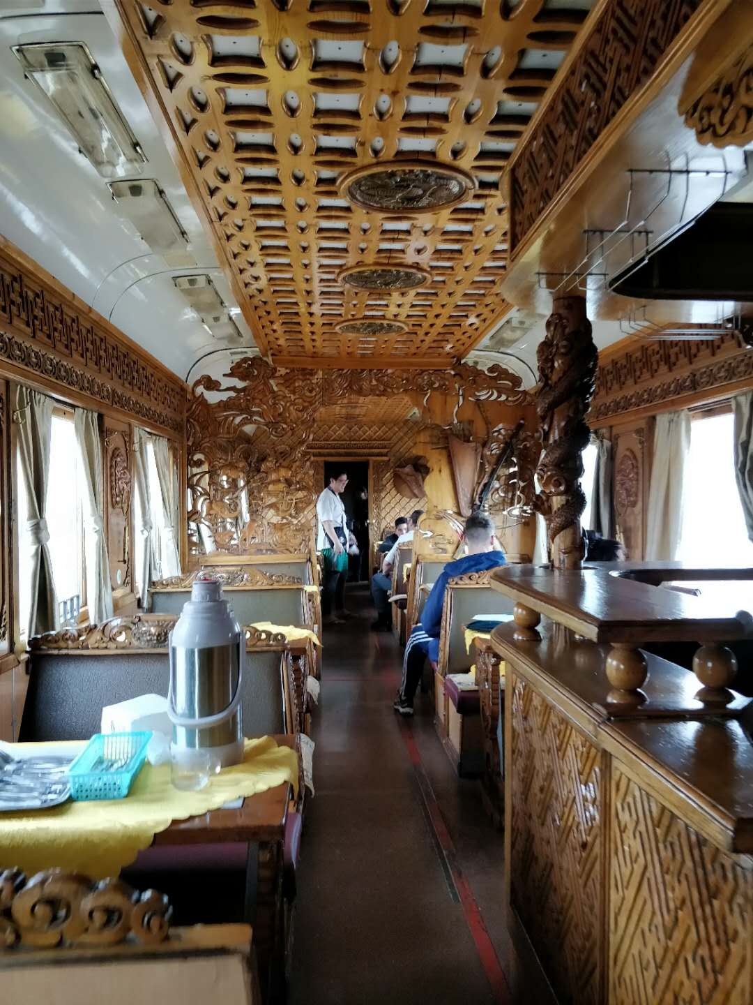 After watching the outside world and relatively samey scenes of the odd horse and yurt, we headed down for breakfast and received a pleasant surprise. During all the train dismantling fun yesterday, it seems that some of the carriages had changed too. Now as we entered for breakfast, we were in an entirely different and exciting environment. The Mongolian dining cart has an incredible exterior, decorated with extravagant finely carved symbols and patterns.