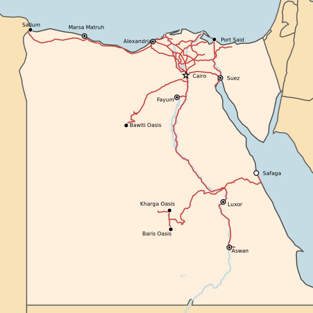Egypt and in particular the Egyptian National Railway have had a train network since the 1850’s, which has been expanded heavily since then. Routs go east to west as well as south and of course covering the Suez Canal.
